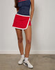 The Andeci Skort in red scuba fabric with white binding. It features a sporty skirt design with binding at the edges, a built-in short liner, and a white ribbed waistband. Paired with the Andeci top.