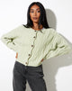 The Beira cardi will keep you warm this season. In a mint hue, it features a diamond cable knit front, long sleeves, crew neckline and oversize tortoise shell buttons. Pair with the Jess Jean and chunky trainer for a casual look.
