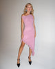 In a pink woven fabric, the Beleri dress features a bodycon fit with a asymmetric hem that falls midi length and a one shoulder, bardot design. Complete with tentacle ruffles to hemline and shoulder.