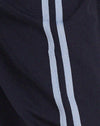 The new Bennett tailored trousers in navy, featuring a double tonal stripe down side seams in baby blue double and an low rise elasticated waist with side pockets.