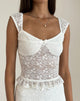 The Brietta Top in ivory lace showcases an unlined bodice with horizontal seam detailing on the cups. Enhanced with small cap sleeves, a ribbon bow in self colour at the centre front, and a charming frill at the hem.