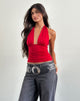 The Cosimo top, in a red jersey fabric, it features a bodycon regular fit with a plunge halter neckline and a ruched body. We love to wear with the Parallel jeans.