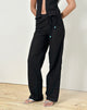 The Cursa trouser in black on a heavy linen fabric base. Normal length straight trouser with waistband belt detailing and a blue beaded tie. Style with the matching Syrma top.