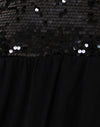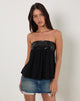 The Danuta top in black features a bandeau neckline with a sequin bust panel and a jersey loose gathered flowy body. Pair with a denim mini skirt.