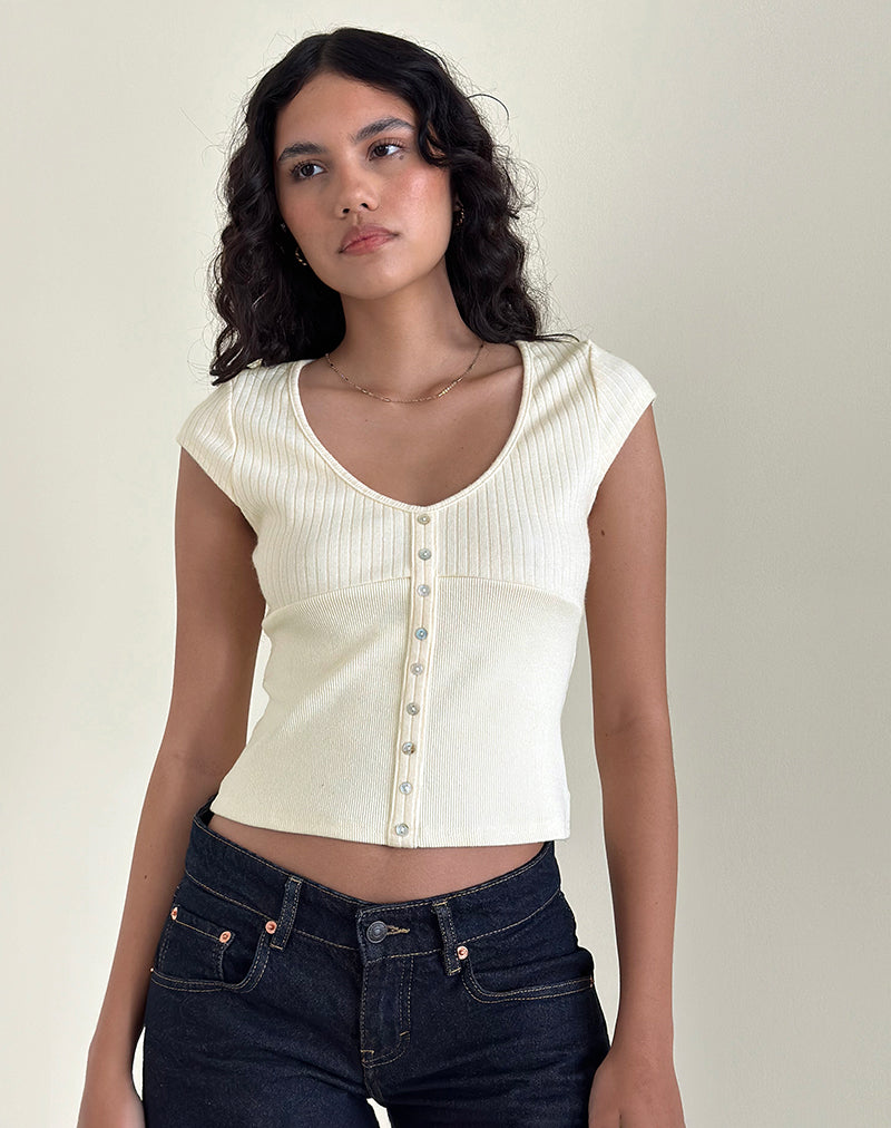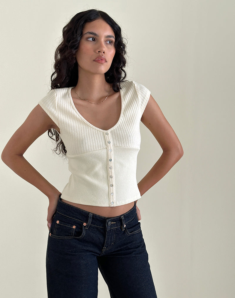 The Dawira top features short cap sleeves, scoop neckline with button through detail down front, with under bust detail in a ivory knit. Pair with our Parallel Low Rise Jeans in Indigo to complete the look.