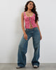In a pink woven fabric, the Esau top features a regular, open front hem with double tie closures, a scoop neckline and thick straps with lace trimming. Detailed with a repeat ditsy floral print. Get the look with our Roomy jean.