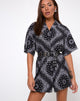 Make a statement with our new Fresia dress! Featuring an oversized fit with a spread collar, button-down front, short sleeves, and a black bandana print. Pair with chunky black boots and a belt for the perfect festival look!
