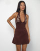 The Hepzhi, a mini style dress with halterneck plunge neckline, finished with decorative floral placement print across the chest. Finished in a bitter chocolate on a rayon jersey fabric base.