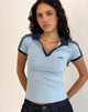 In nantucket blue, the Isda top features a polo design with a regular fit, short sleeves and a collared V neckline. Detailed with navy stripe binding on the shoulder and an embroidered M.