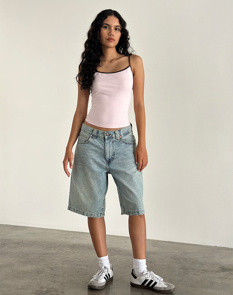 The Jastiya top features a plunge scoop neckline, the back mirroring the front with contrast deep mahogany binding along the neckline and arm hole, cut from a soft lycra in green banana. Style with our Roomy jorts.