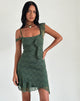The Jati dress in sage Canina rose lace. Mini fit with asymmetrical straps with ruffle detail and asymmetrical hem.