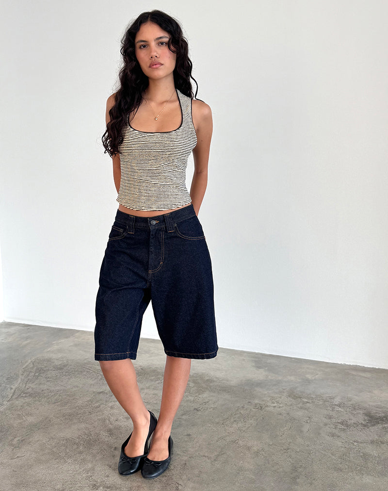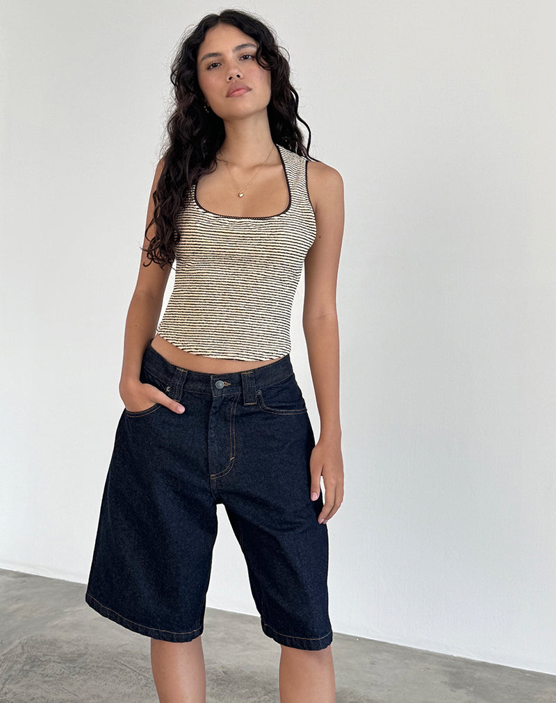 Sleeveless yellow and black stripe crop top in a lycra material featuring thick straps and a square neckline with picot trim. Styled with our Skater shorts.