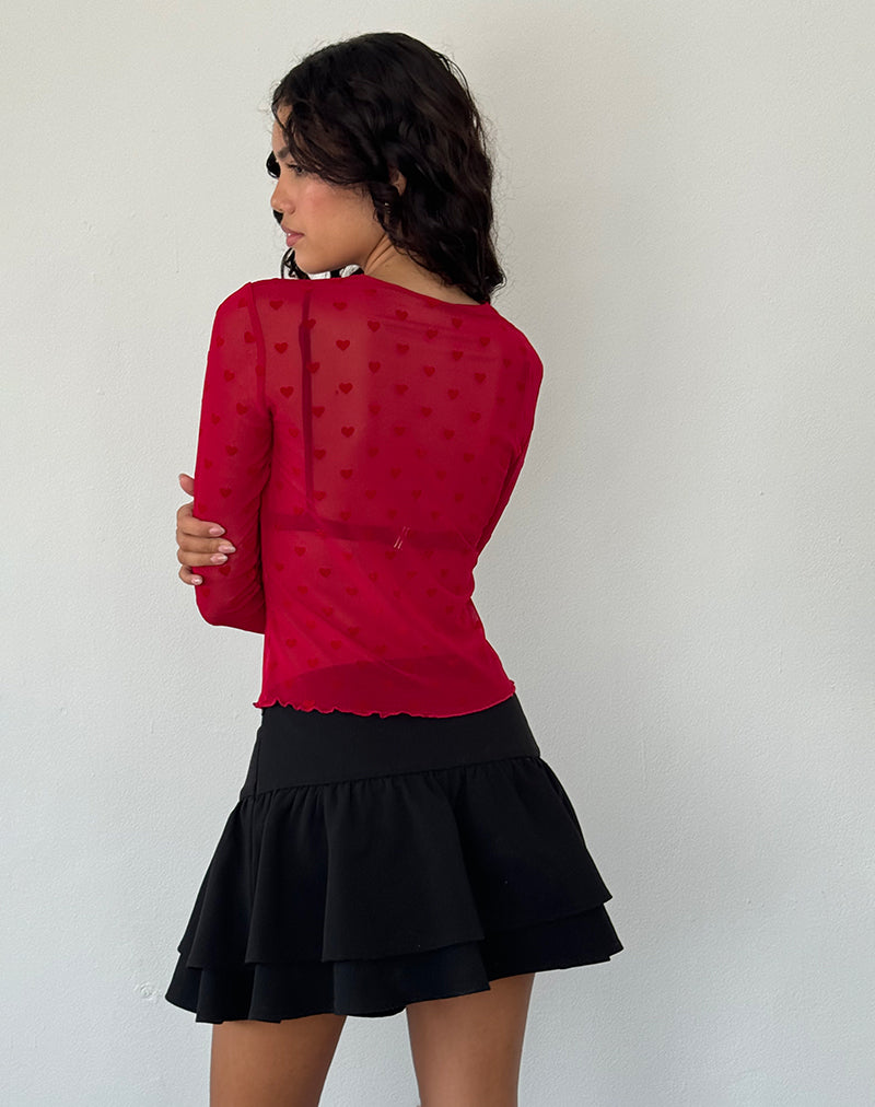In an unlined red heart flocked mesh, the Kahula shirt features a slim fit with button up front, long sleeves and a crew neckline. Finished with a lettuce hem. Complete the look with our Samrina mini skirt.