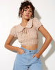 The 70's prairie girl floral print needs space in your 'drobe. In a nude floral print, the Kamiko top features a cropped fit with all over shirred detailing, short sleeves and oversize collar. Pair with the Loose fit denim short for a casual look.