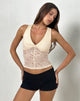 The Kefira top in paisley cream lace is a fitted V-neck button-down top featuring picot trim along the neckline. It includes fabric-covered buttons down the center front and lined cups. Complete the look with our Eunia shorts in black.