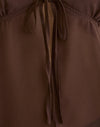 The Kota blouse top in a burgundy chiffon fabric features flowy short sleeves and hem, and a tie under the bust, with an open V-neckline.