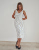 Sleeveless midi dress with deep v neck, Lavisha features an underbust detail finished with a centre front bow, picot trim along the neckline and shoulder straps and a loose flowy hem in an ivory lightweight non stretch viscose printed fabric with a muted yellow floral.