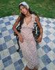 Lavisha dress in printed ditsy SSR fabric. Sleeveless midi dress with deep V neck, under bust detail, CF bow in self fabric picot trim along the neckline and shoulder straps and a loose flowy hem.