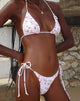 Super low rise brazilian cut bikini bottoms with adjustable ties at each side finished with a small picot trim along the edges in a red floral beige gingham print, with ruffle trim. Best paired with our matching Pami bikini top.