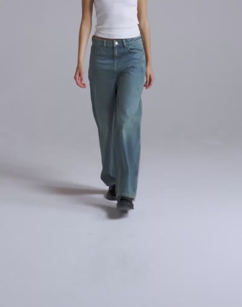 Low rise style with an extra wide, baggy oversized fit featuring a concealed zip with button fastening and belt loops, in a vintage blue green. Complete the look with grey marl Clio baggy tee.