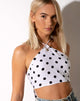 You are sure to get spotted in our Maudy top in 80’s polka dot! This top features a cropped fit, halter neck silhouette in a black and white polka dot print. Pair with our matching sheny skirt in 80’s polka for a look that sure to stand out!