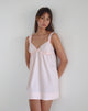 Cami mini dress with thick ruffle straps, triangle cups with an under bust frill detail and gathered seam to create a voluminous body finished with a deep hem detail and lace trim along the edges of the cup and a small decorative bow at the centre front in a light pink non stretch cotton