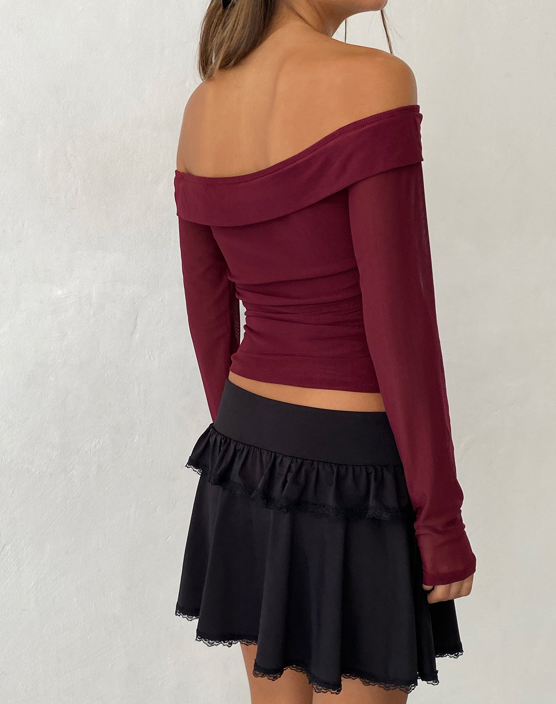 Long sleeve mesh top in maroon. Featuring a full length body and bardot off-shoulder twist detail design.