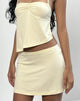 The Nidya skirt in a lemon rayon fabric, features an a line, low rise, mini fit. Pair with the Kins top.