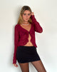 Get romantic with our Noemi Cardigan, A deep V cardi with a large ruffle detail along the neckline to hem, with a hook and eye closure and long sleeves. Complete with a babylock lettuce edge, on a burgundy mesh fabric. We have paired ours with our Lidya mini skirt.