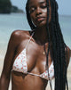 Our Pami is a halter neck triangle bikini top with adjustable ties at neck and at back, finished with a picot trim along the neckline in a red floral beige gingham print, with ruffle trim. Best paired with our matching Lentra bottoms.