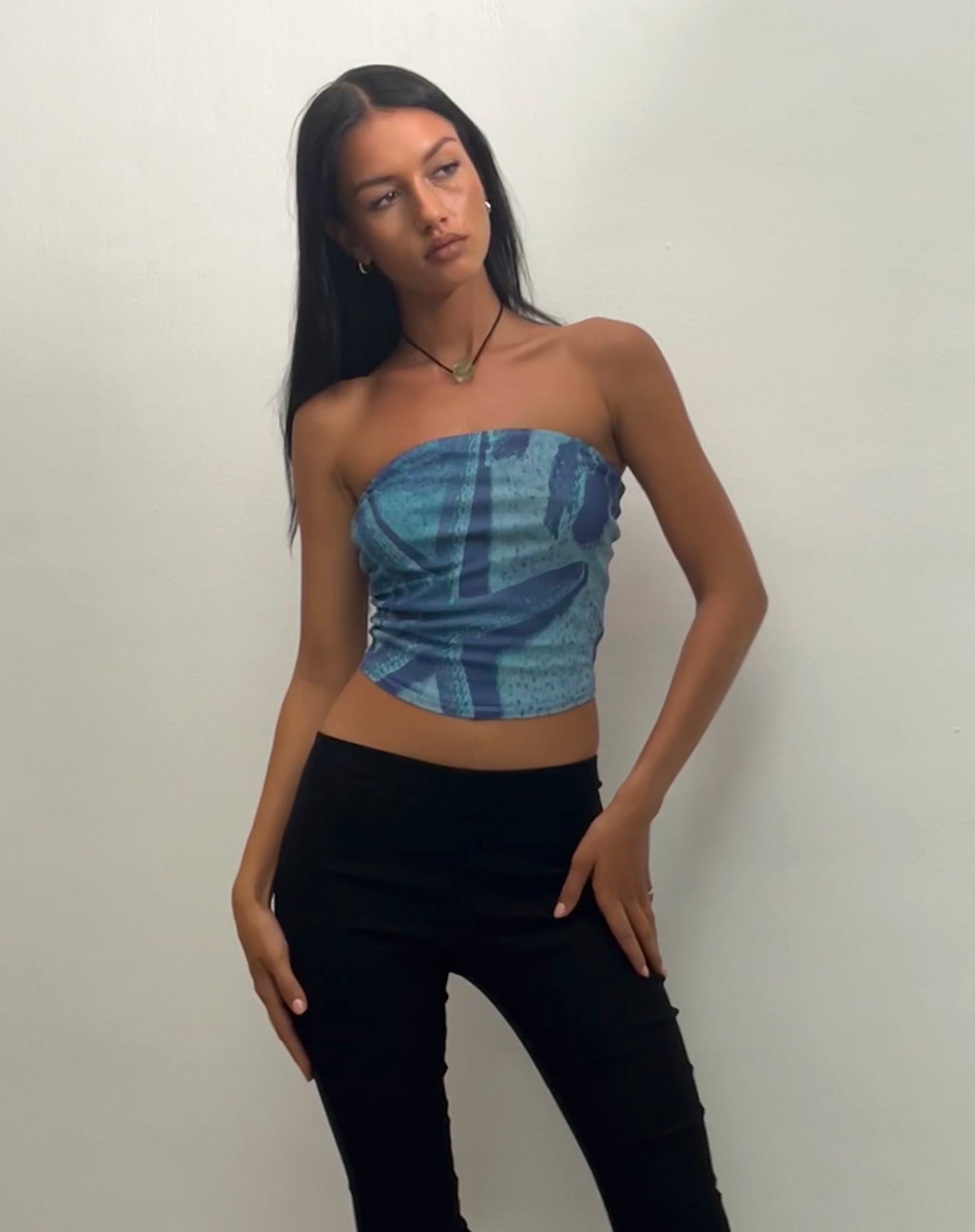 Bandeau top with a blue starfish photoprint in a mesh bodycon fit with poly lining. We love to style with our Asla capri trouser.