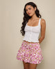 The Raffita skirt in a pink blossom floral print on a poplin fabric base. Featuring a thick low rise waist band, micro mini fit and loose pleat detailing. Paired with Sayake top.