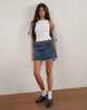 In heritage blue, this denim skirt features a micro mini length, a-line hem with a raw edge and a low rise fit with a zip and button fastening. Pair with our classic Dudley vest top.