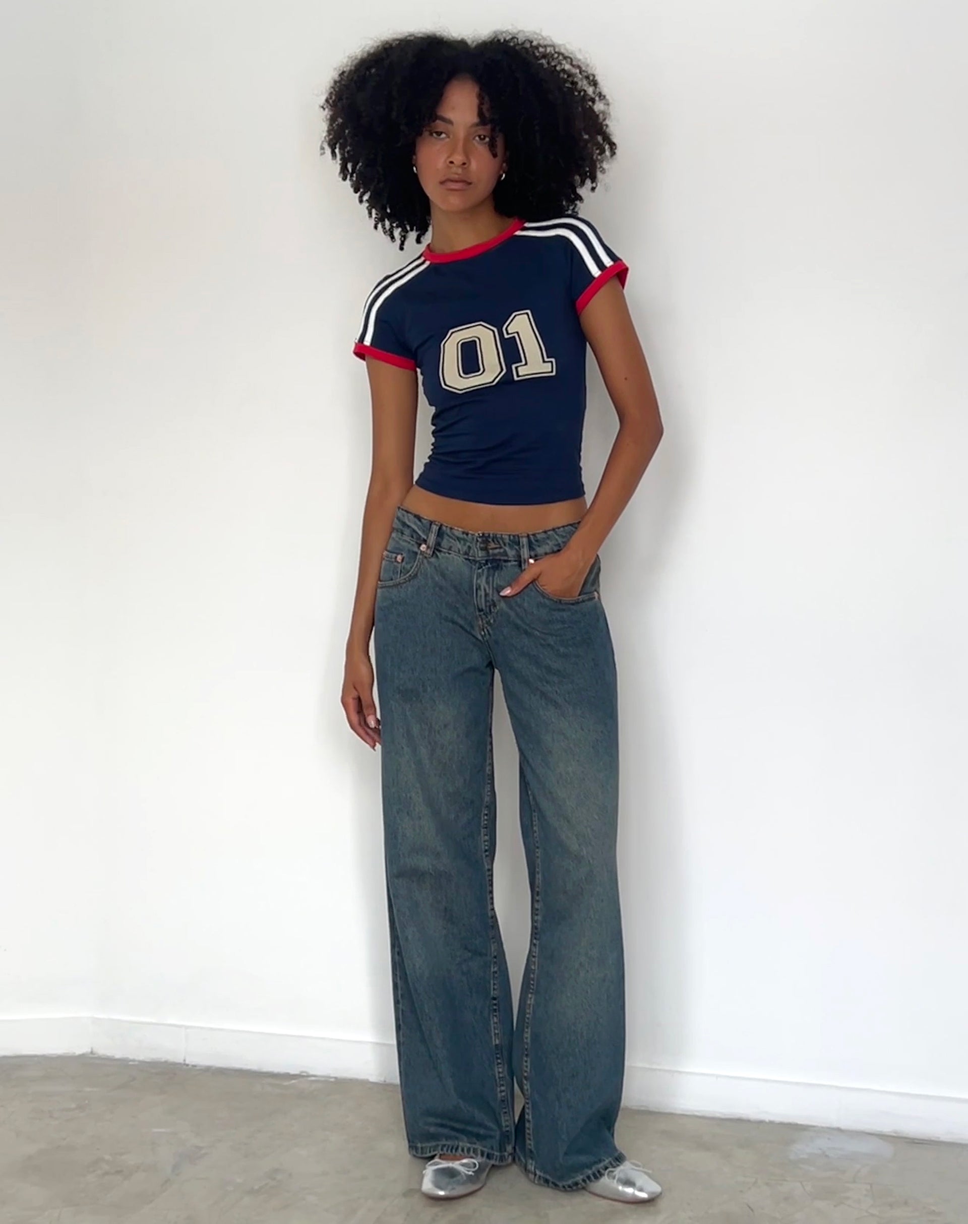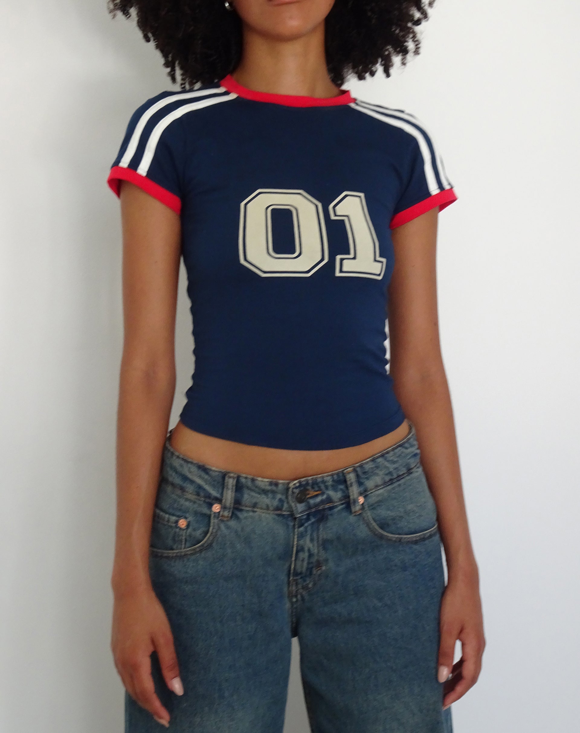 Get the sporty look with our Salda Tee. It comes in a navy colour, features red binding on the cuffs and neckline, white stripes on the shoulders and 01 printed on the centre of the top. We love to wear with our Lia skirt.