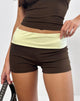 The Sea short in a chocolate brown rayon jersey fabric with lemon fold over feature. Complete in a micro hot pant style. Complete the matching set with Inrida halterneck top.