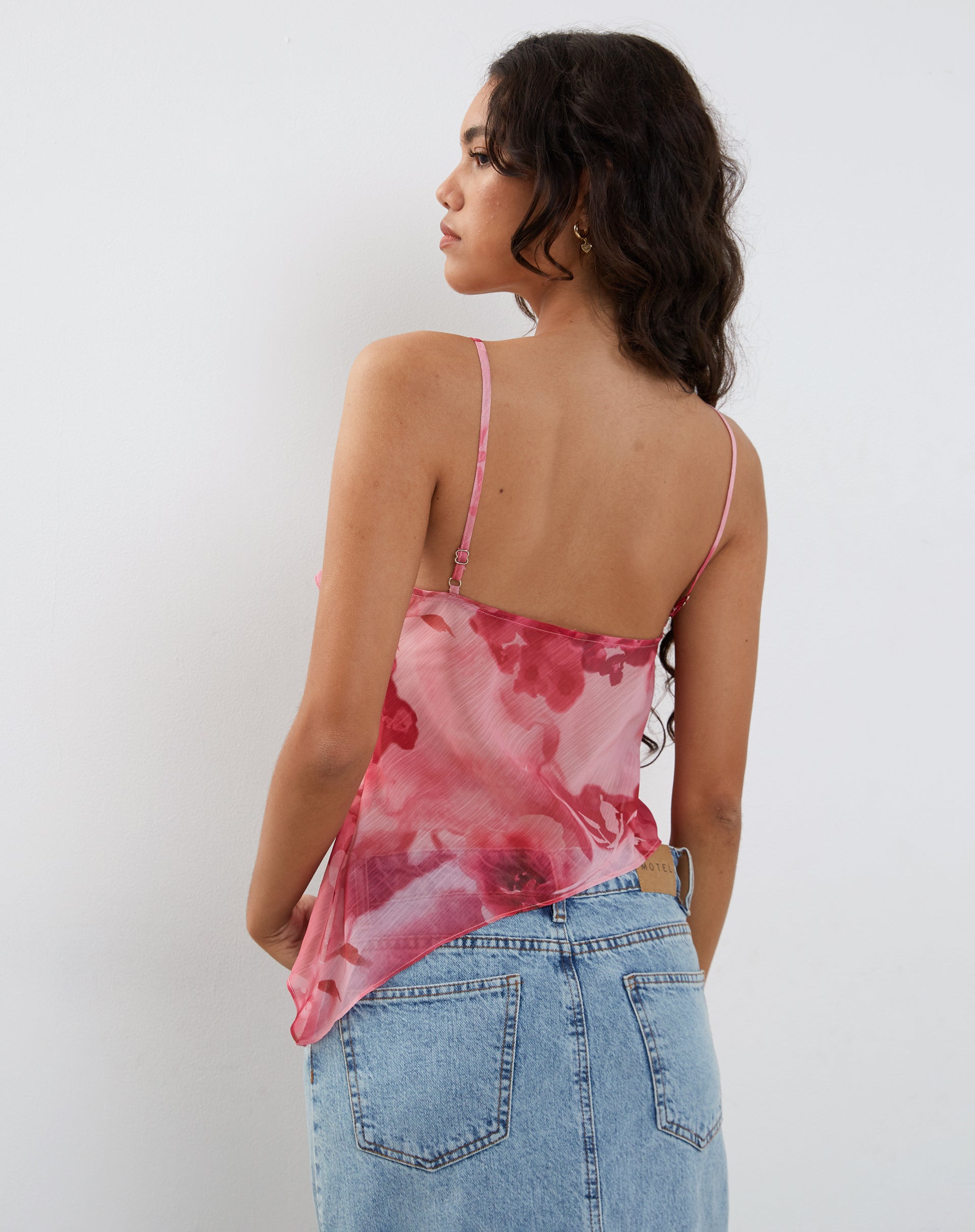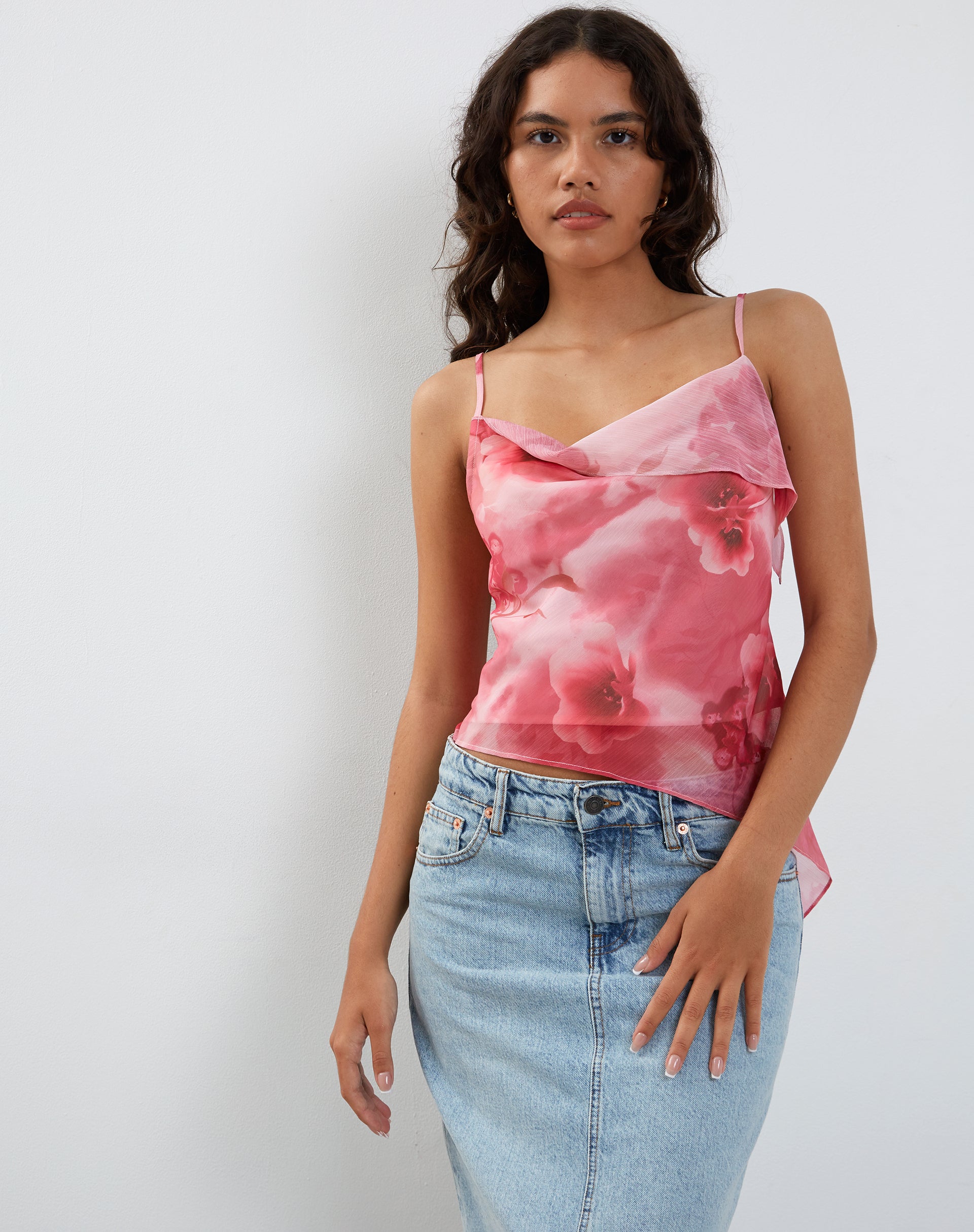 In a pink chiffon fabric, our Shahira top features a loose fit with an asymmetric hem, cami straps and a cowl neckline. Detailed with a repeat floral print - perfect for festival season. Styled with our Denim Maxi Skirt.