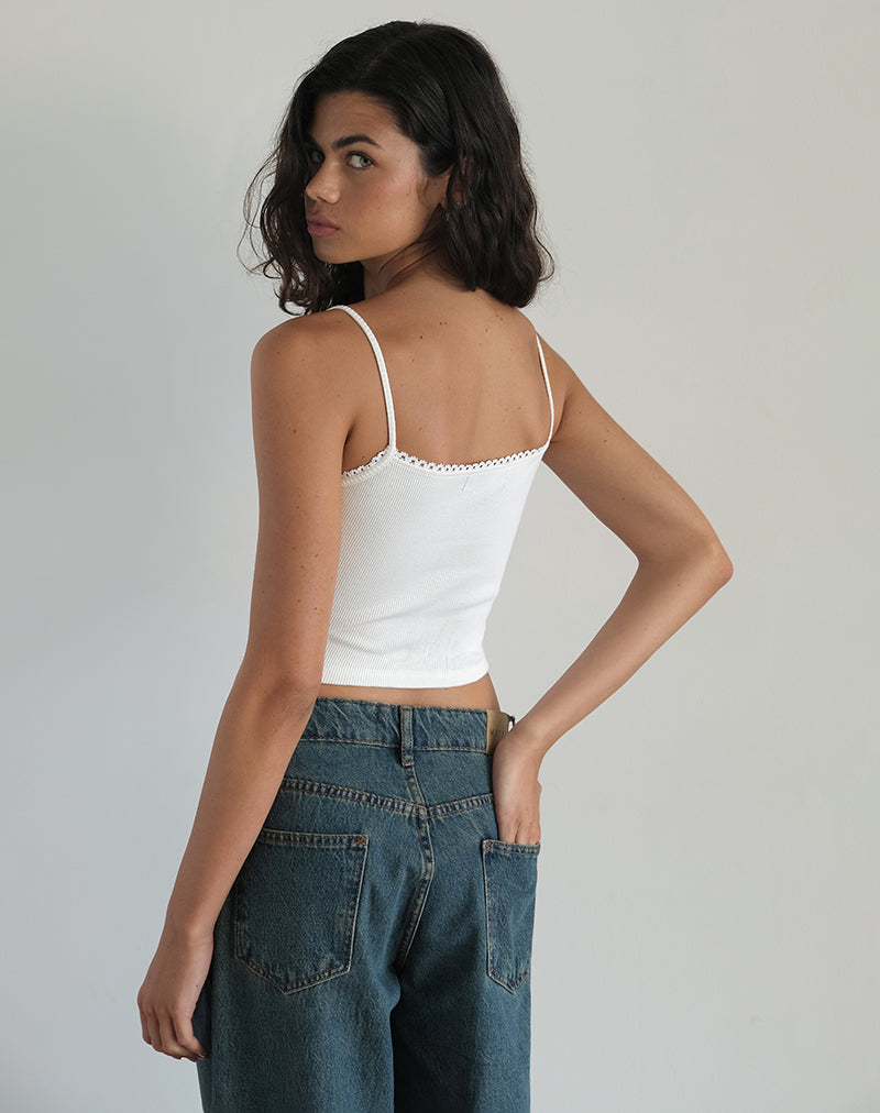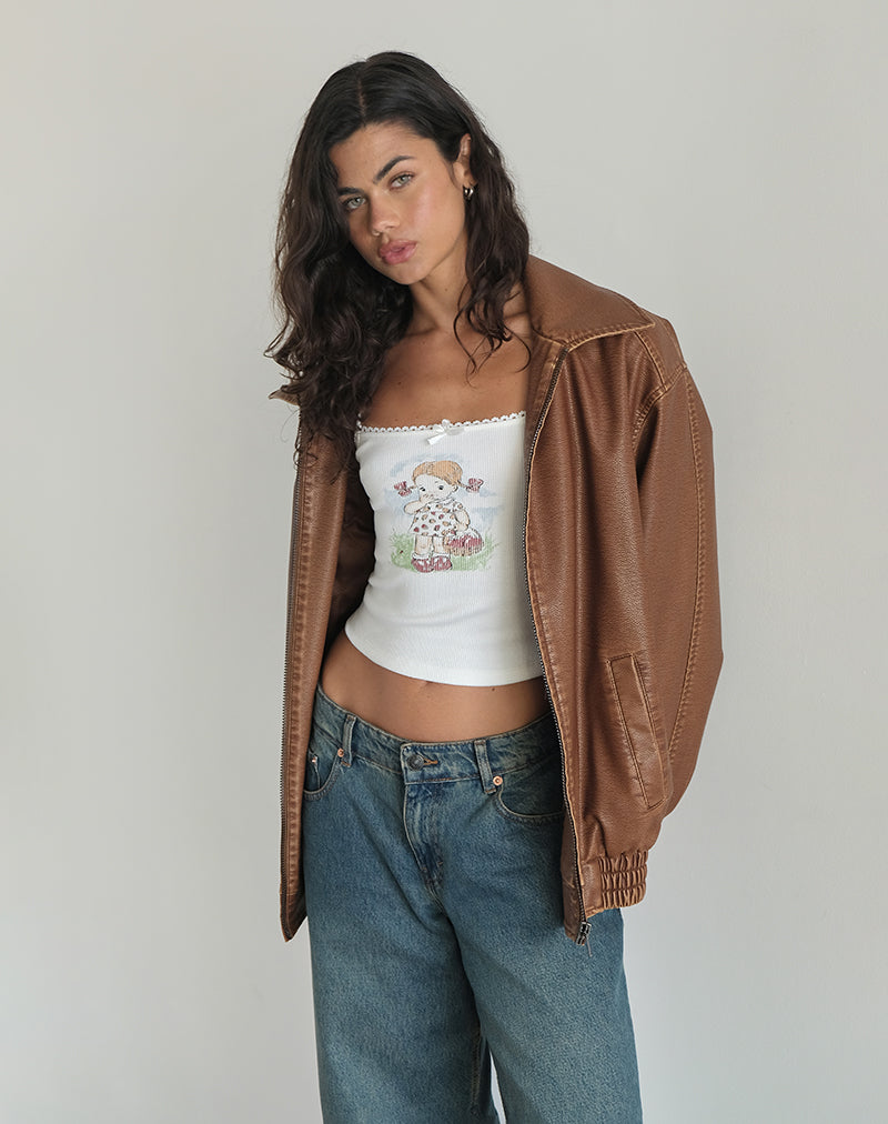 Slim fit vest top in regular length, Suna features thin cami straps and a scoop neckline in an off white ribbed fabric, finished with a picot trim along the neckline and arm hole, a centre front bow and a colourful printed 'little girl' graphic. Complete the look with our Renha shorts.
