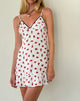 Cami mini dress with thin adjustable straps, triangle cup, loose fit body and a deep ruffle hem finished with a concealed zip and black picot trim along the cup and arm hole in a ivory lightweight non stretch viscose printed with a black polka and red ditsy floral.