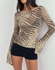 The Tineko top in a neutral wild animal printed mesh. Featuring long oversized sleeves that flare past the wrists. Complete in a bodycon and regular length fit. This top is unlined. Style with our Eunia shorts.