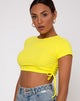 Bright and Beautiful! Make summer come early with the Tiner Top featuring a cropped fit, short sleeves and ruched drawstring sides. Team this with Mom jeans and docs or white trousers for that summer feel.
