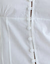The Yamila blouse in dark navy poplin features a keyhole detail on the chest and a button-up collar. Boasting a corset style body and button down front. Also includes puff sleeves and a frill hem on the bottom. We paired with our Roomy jeans in powder blue wash.